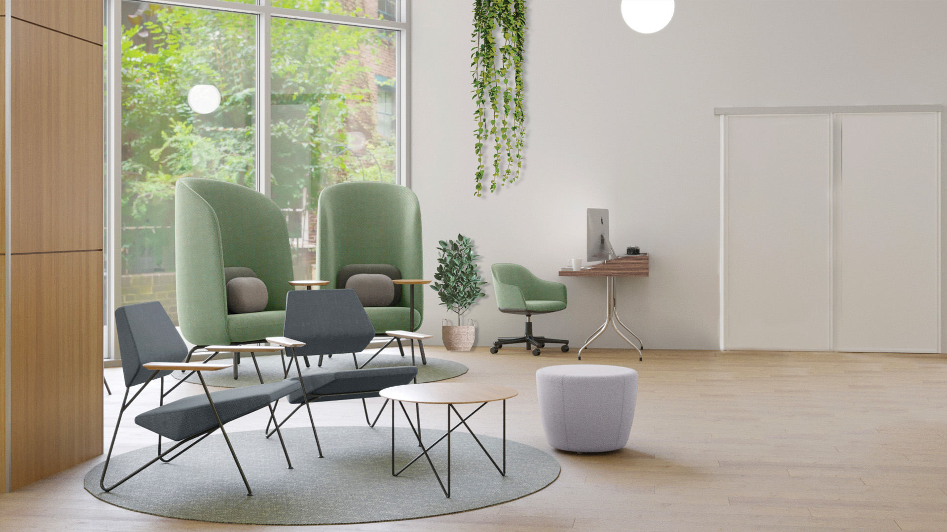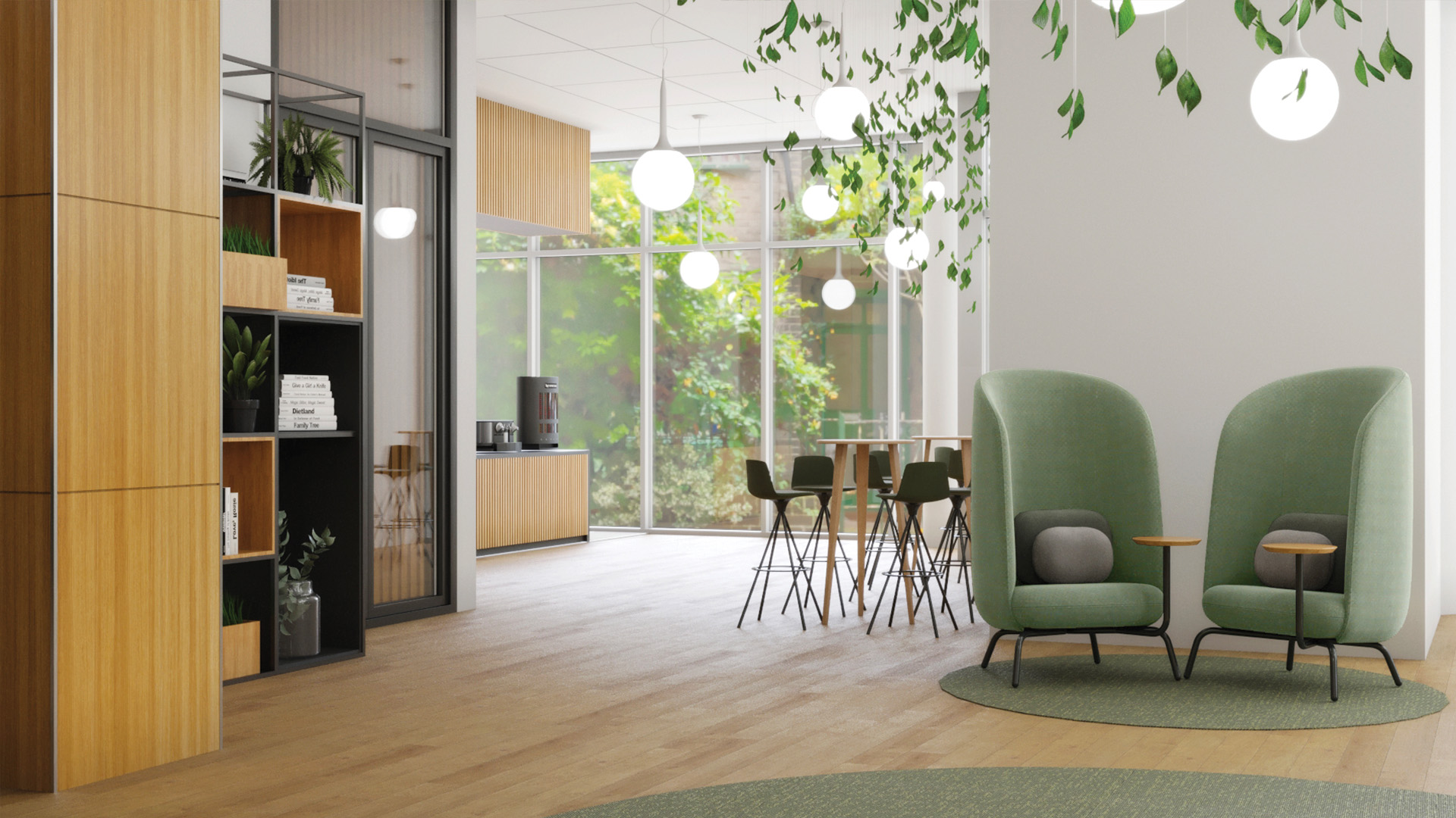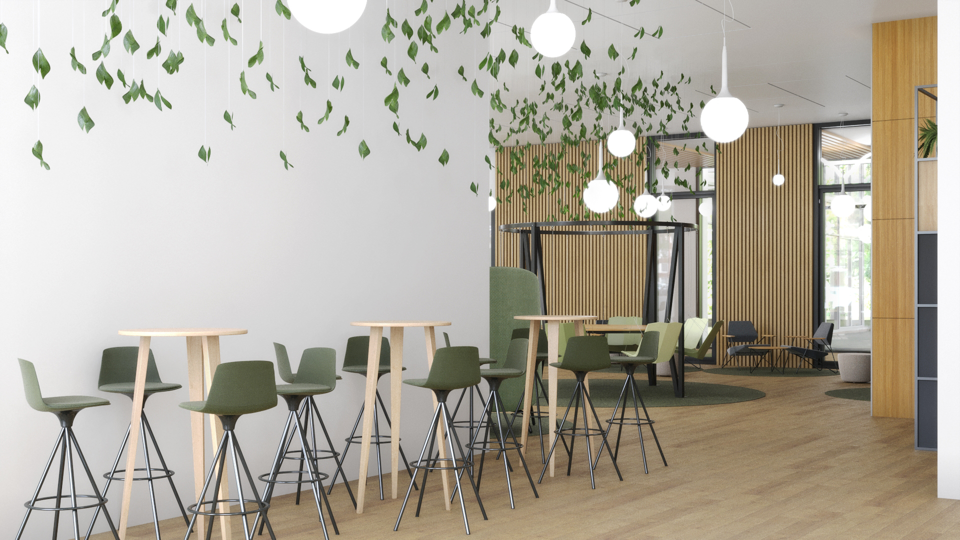 et son coworking corner au mobilier original est une destination intérieure pour partager des moments de convivialité.